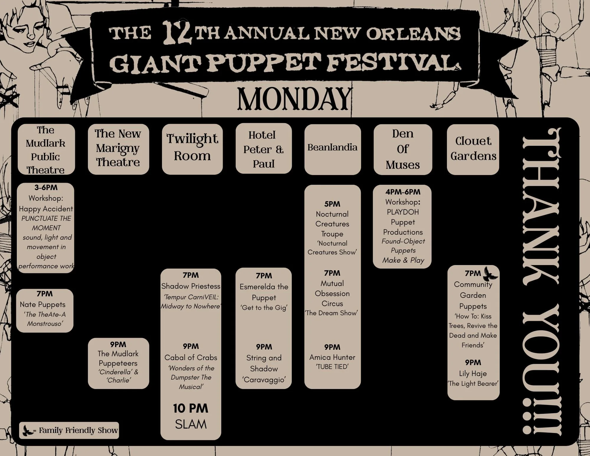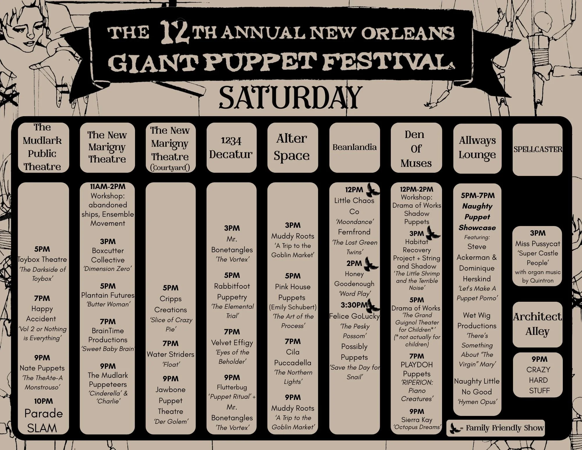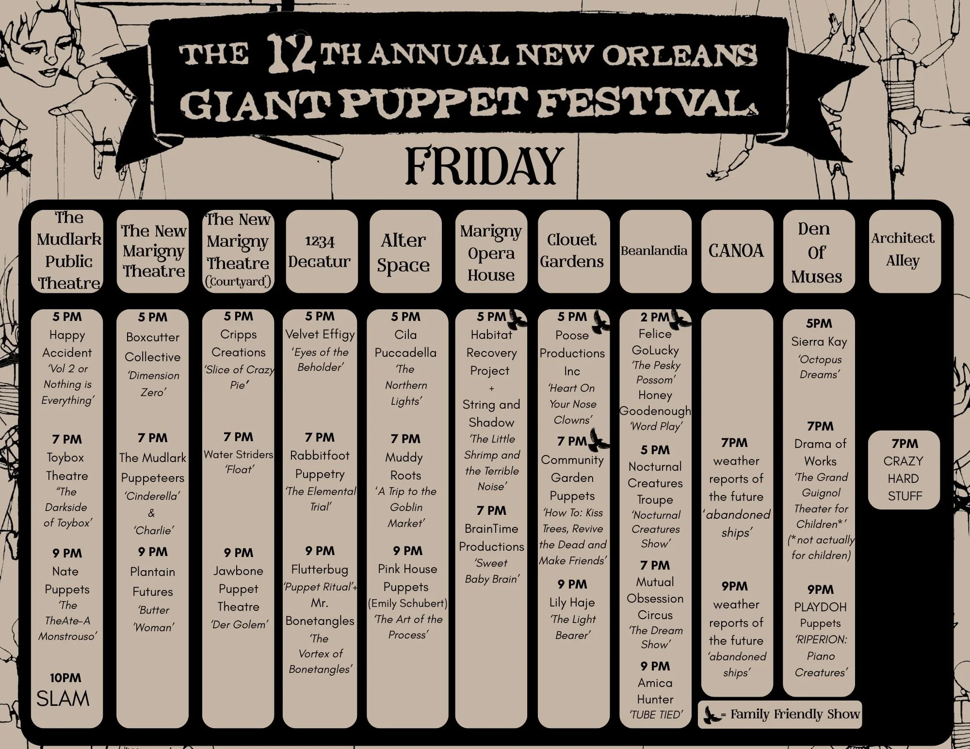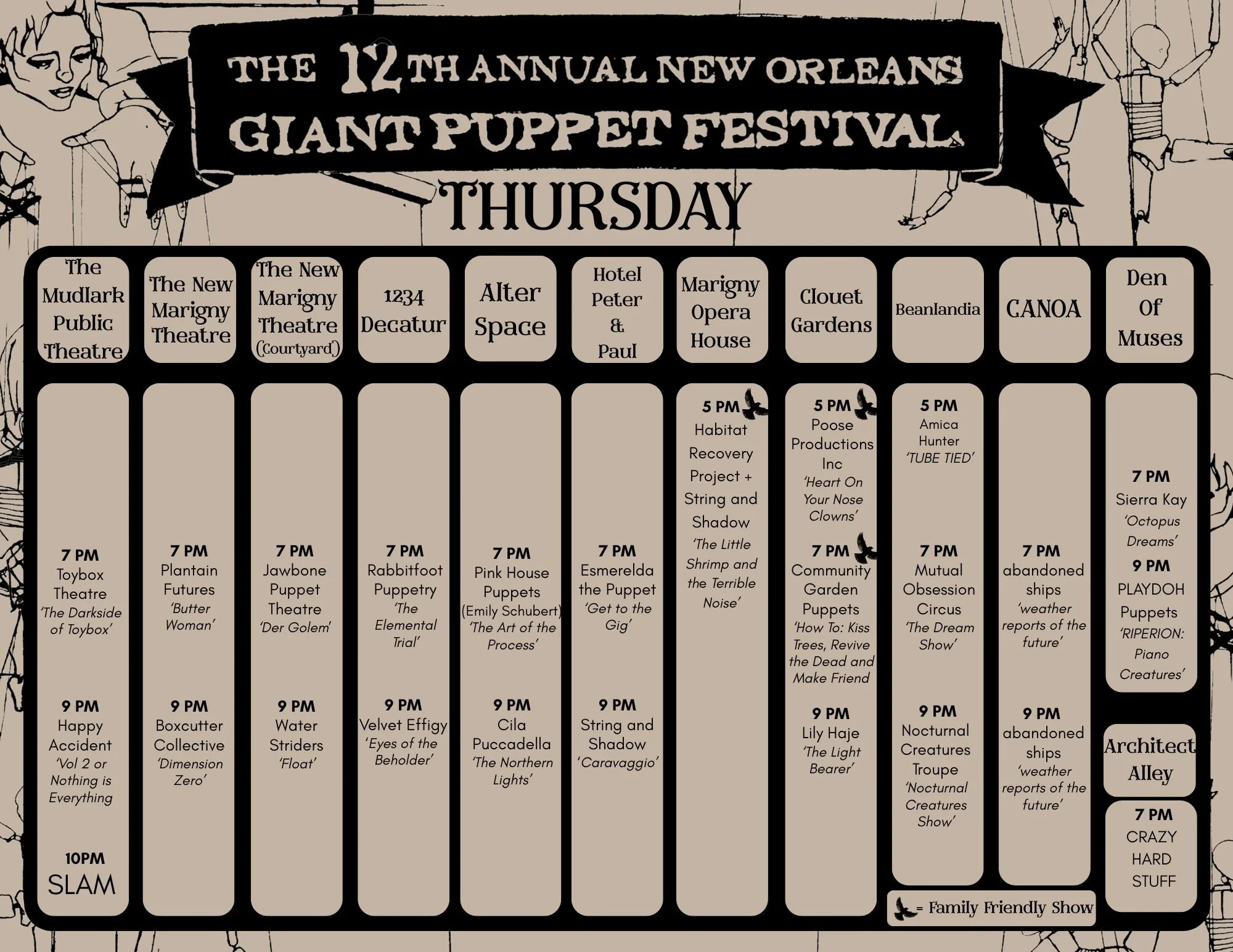 Individual show tickets can be found in our New Orleans Giant Puppet Festival Box Office on TicketLeap here or in the line-up. Individual tickets are sold on a sliding scale from $15- $25 available at checkout.